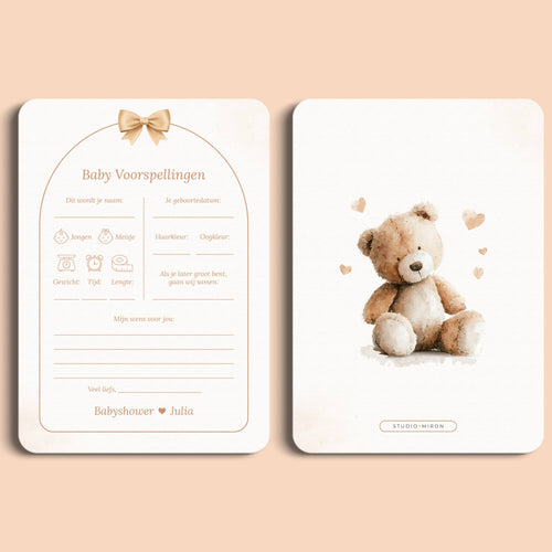 All products are carefully made in our own studio. We use FSC-certified paper and sustainable materials to ensure each card stays beautiful for a long time. You can order individual cards or choose a complete baby shower set. Always fairly priced, quickly delivered, and fully personalized.